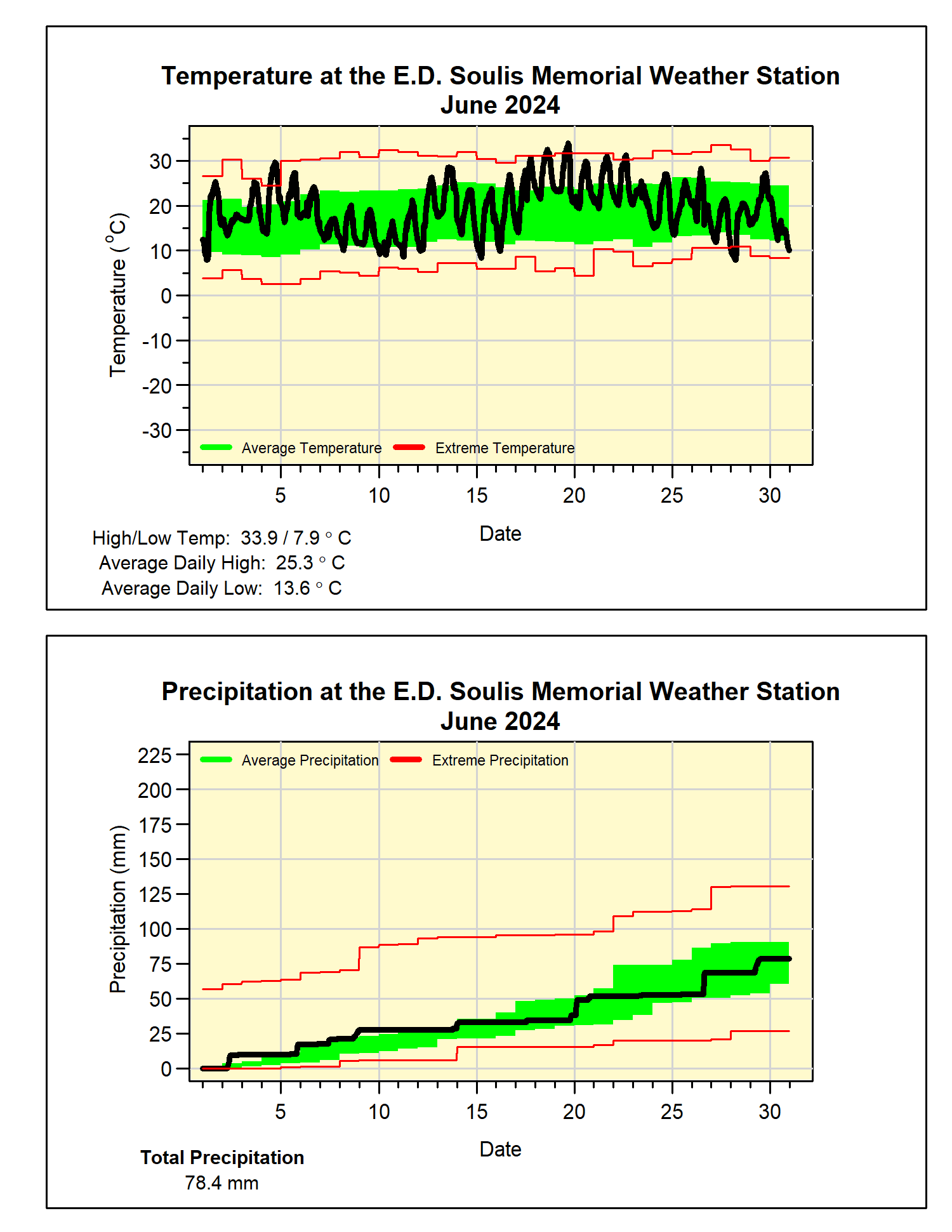 With that extremely hot stretch of 6 days and just a few colder than average days, it is not surprising that overall June was a little more than a degree above average. Interestingly in the just over 25 years of data at the Soulis memorial weather station, the month of June has not been that extremely warm, so this June was only the third highest. Also, we have now had 7 months in a row with warmer than average temperatures.
